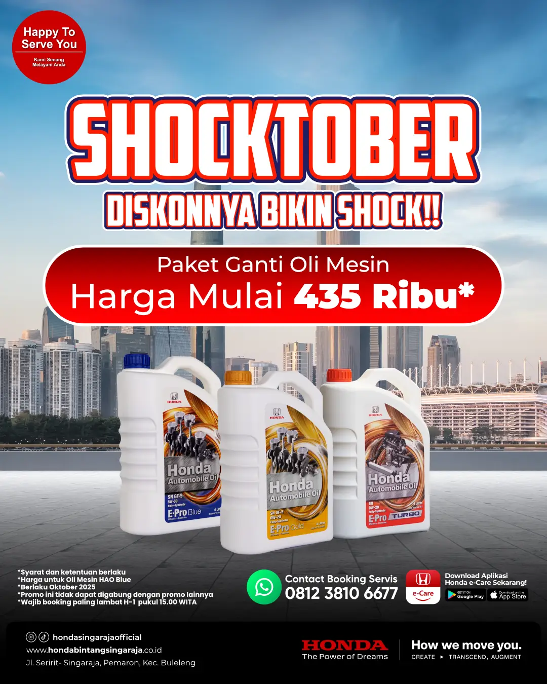 Bulan Oktober 2025 datang membawa kejutan istimewa dari Honda Bintang Singaraja! Kali ini, bukan sekadar promo biasa, tapi promo SHOCKTOBER yang benar-benar bikin semua pemilik mobil Honda terkejut dengan harganya. Siap-siap, karena ganti oli mesin kini bisa dilakukan dengan harga super hemat, mulai dari hanya Rp 435 ribu saja!
